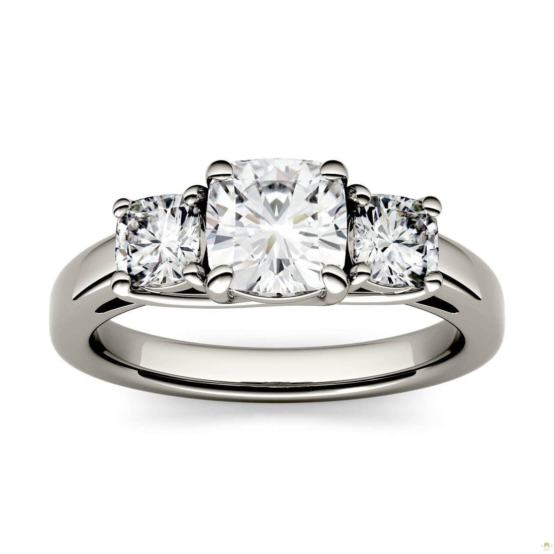 A larger cushion cut moissanite stone is showcased in the center of this three stone...