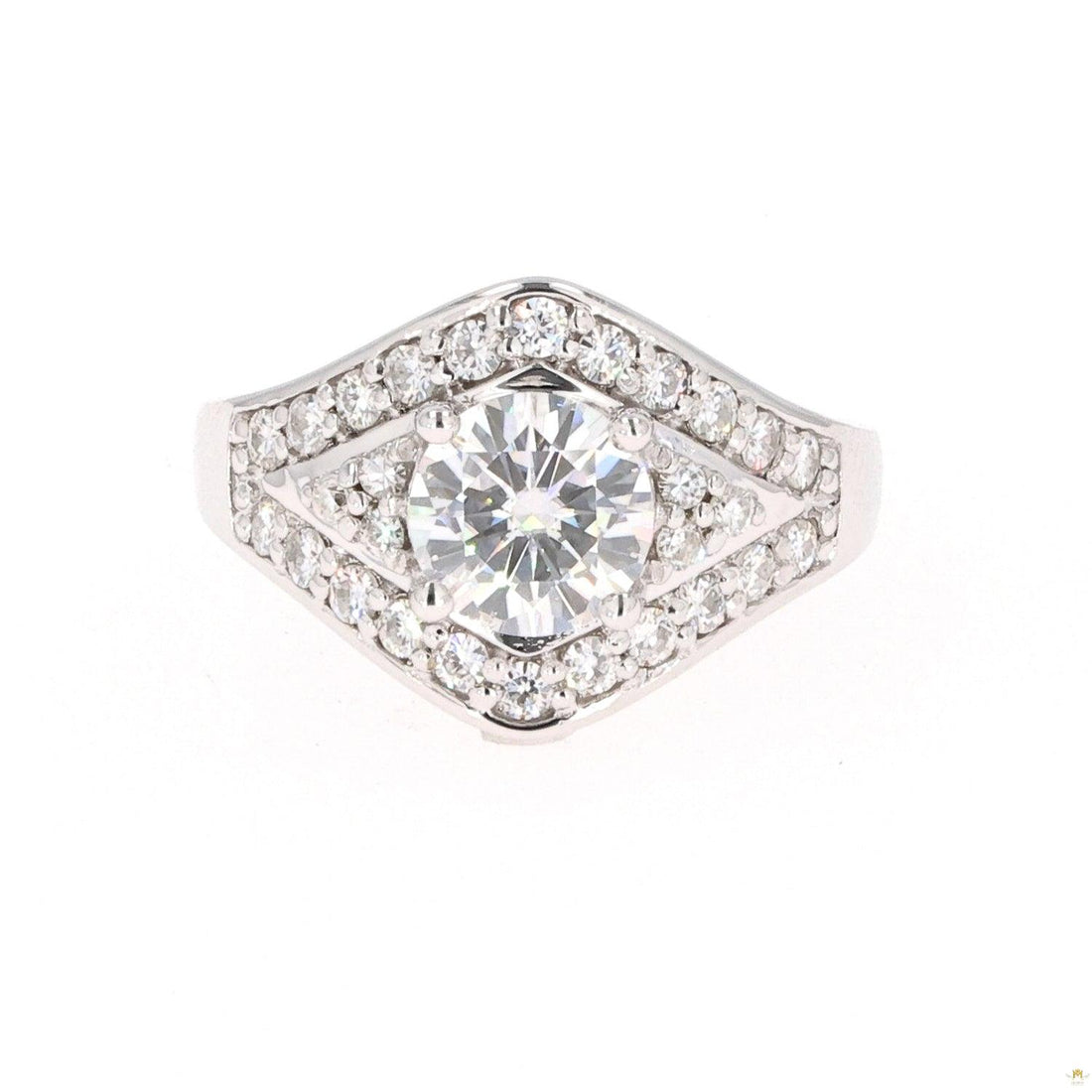Highlighting 29 glimmering moissanite gems, this gorgeous round solitaire ring weighs in at 1.73 diamond...