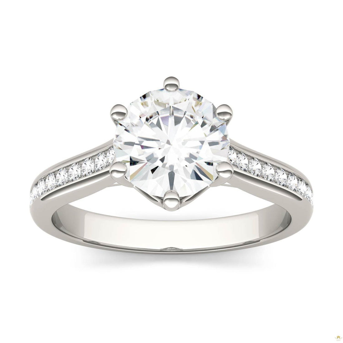 This six pronged setting houses a brilliant round cut moissanite gem, accented with cascading side...