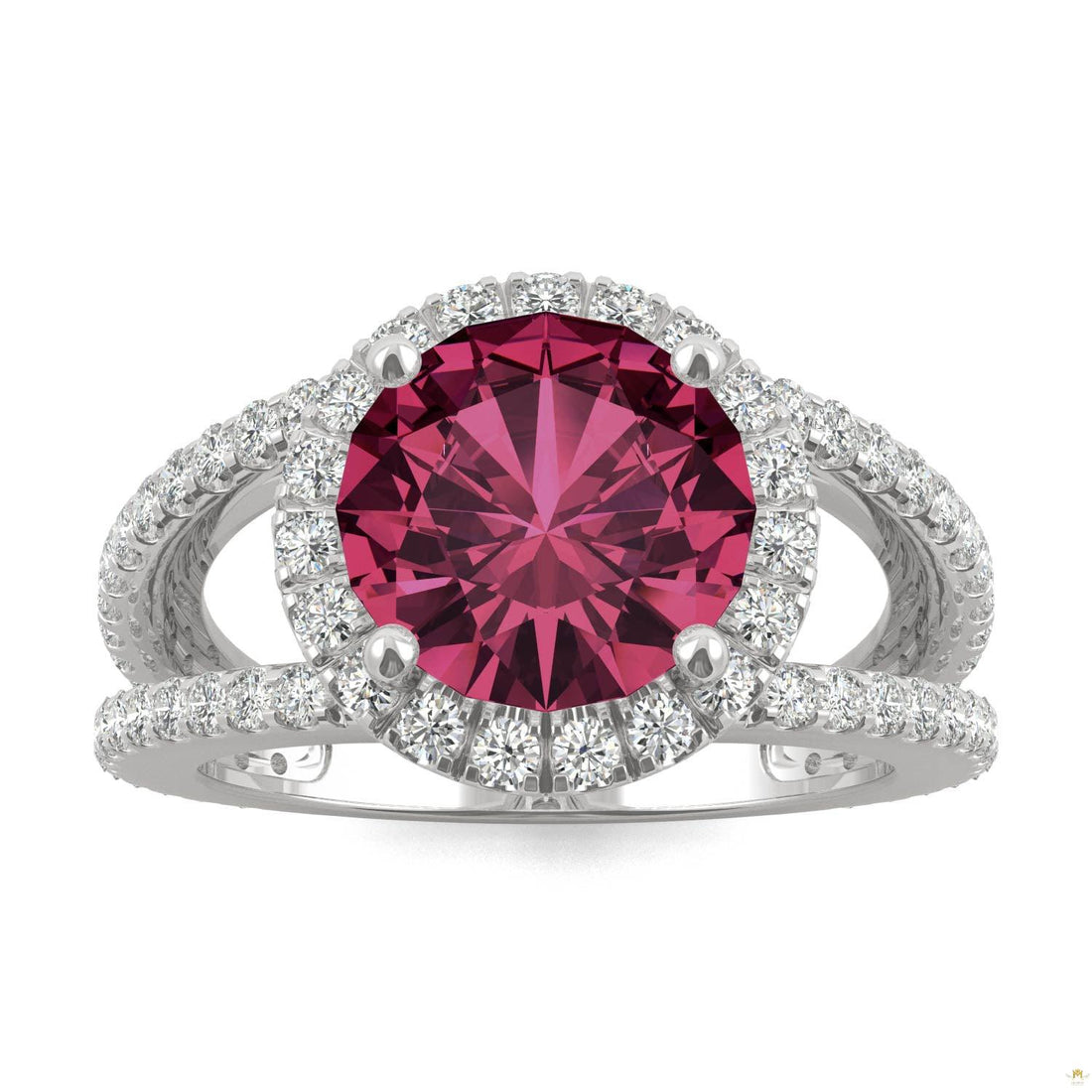 An exaggerated split shank is lined with shimmery melee as a stunning round ruby shines...