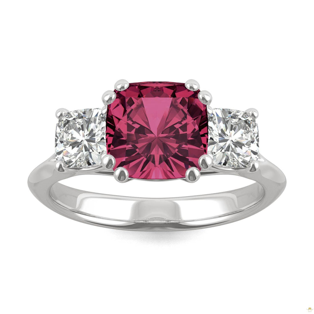 Three gorgeous cushion cut gems illuminate this three-stone ring. A larger ruby set in double...