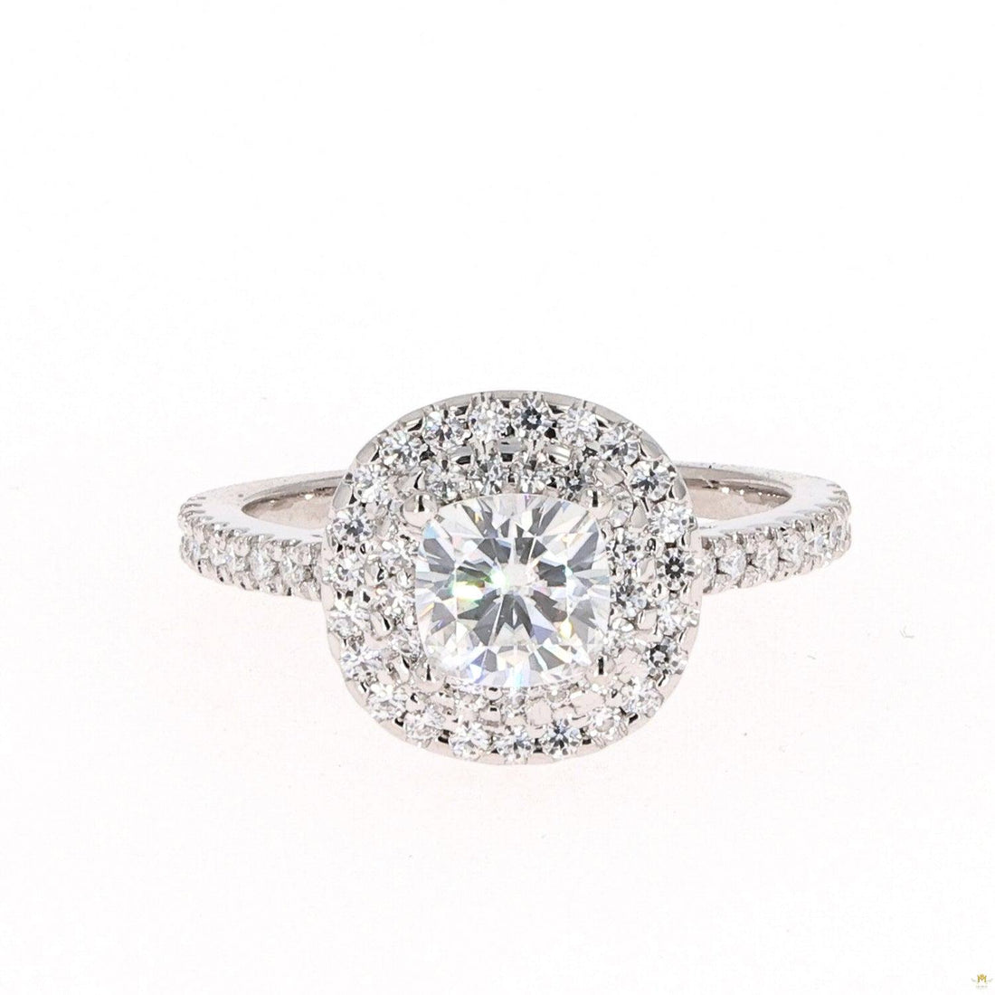 Featuring 35 sparkling moissanite gems, this awe-inspiring cushion halo engagement ring weighs in at 1.37...