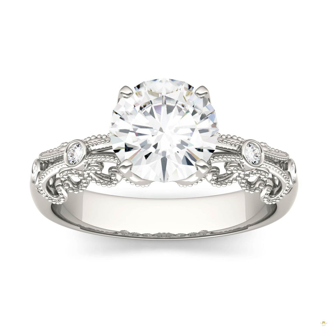 Boasting a vintage aesthetic and chic appeal, this round brilliant moissanite solitaire engagement ring features...