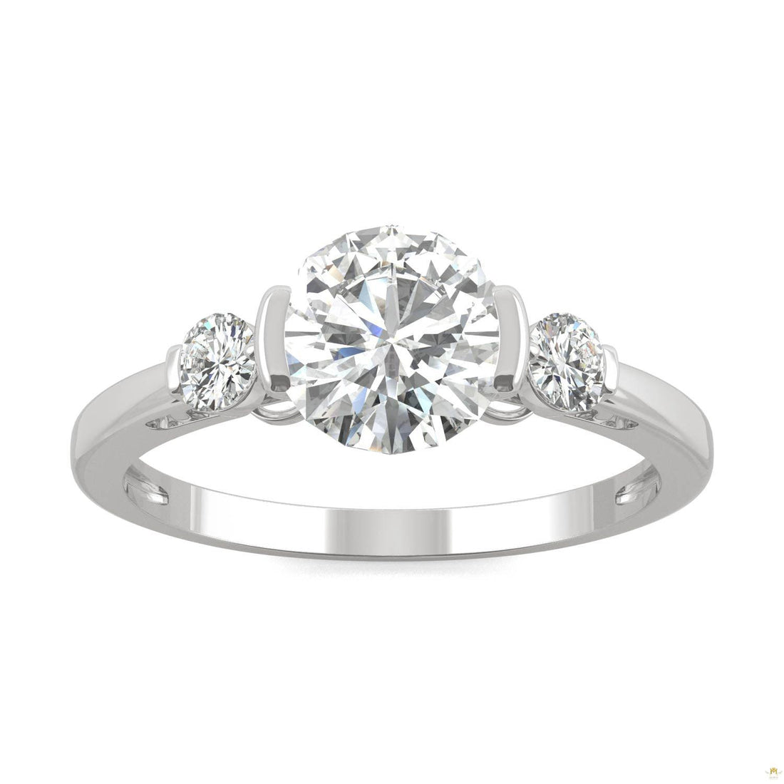 A half bezel setting updates this timeless engagement ring with modern edge. Nestled between two...