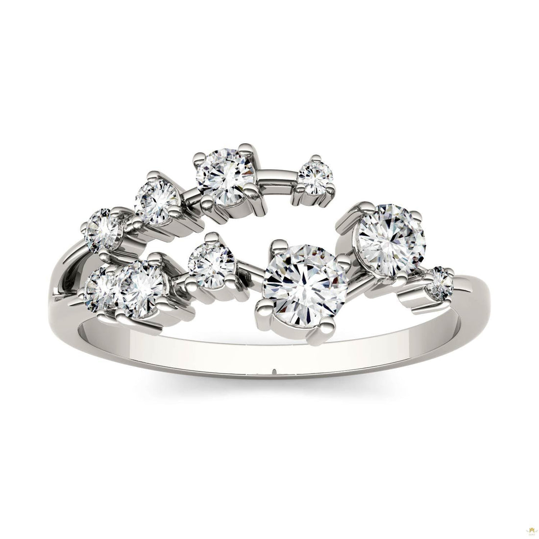 Highlighting nine sparkling moissanite gems, this brilliant round statement ring weighs in at 0.74 diamond...