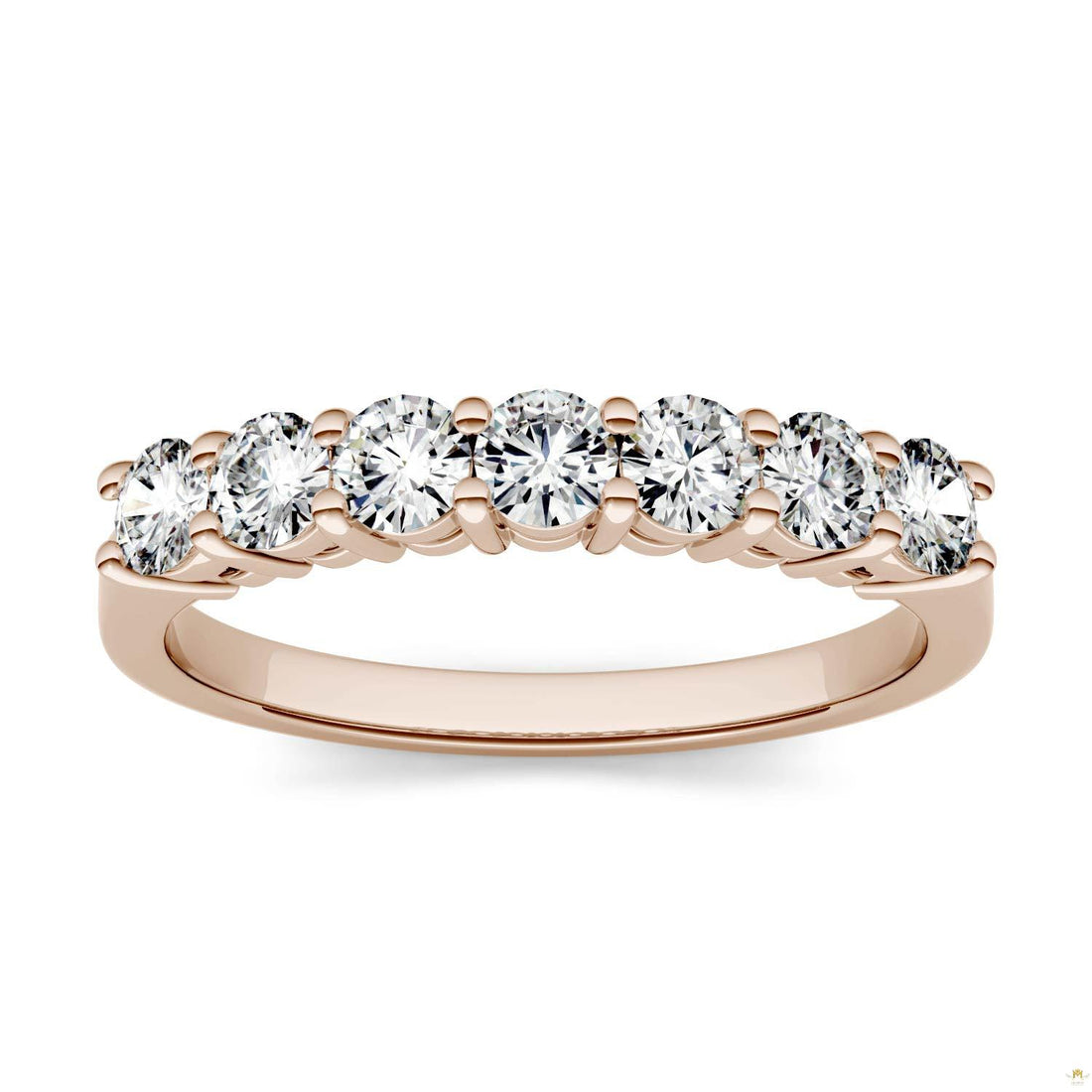 Doused in the brilliance of seven 3mm round moissanite gems, this 14k rose gold band...
