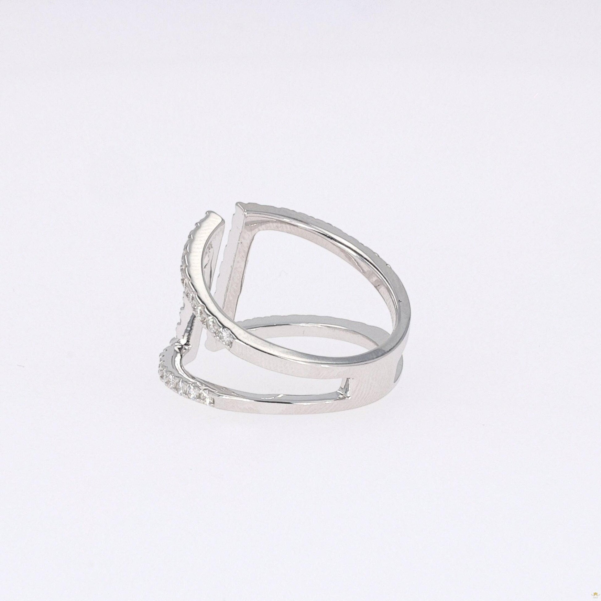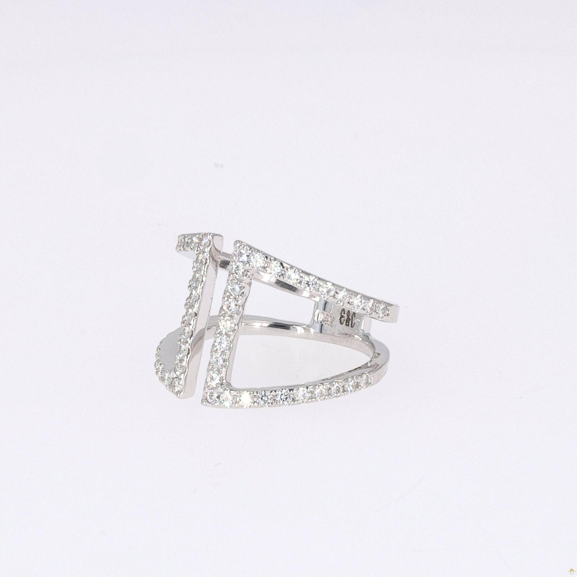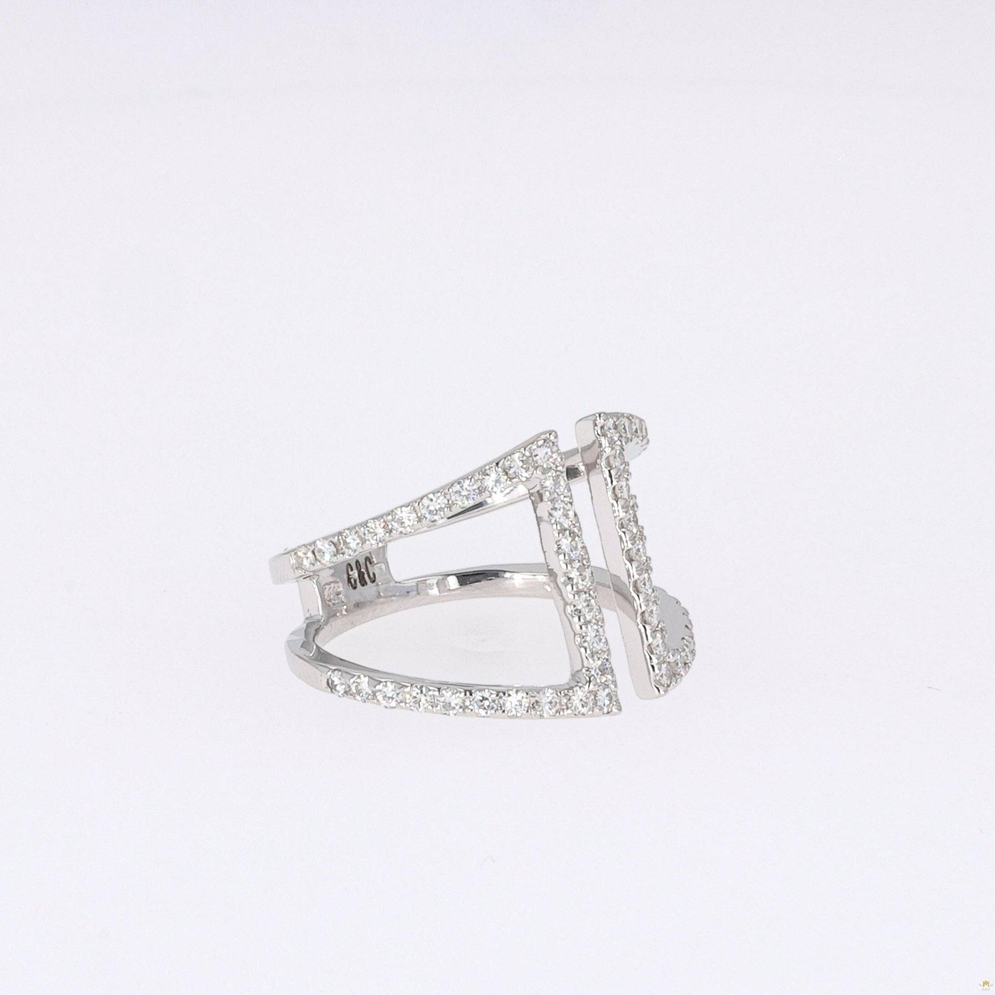 This 14K white gold, 0.54 carats moissanite fashion ring is perfectly elegant! With a wide split shank design, the sparkle is showcased in a bold and geometric way that still feels tasteful and timeless, too.