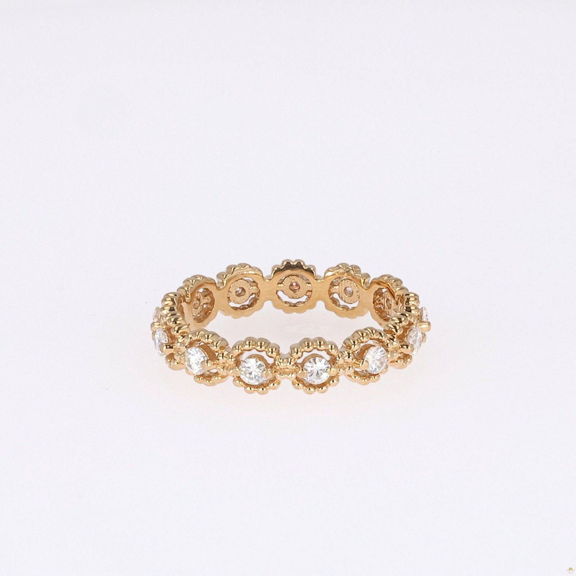 The perfect ring to show off your bold style – this 0.59 carats, 14K yellow gold moissanite band has a bright geometric silhouette and will add an artsy vibe to any look.