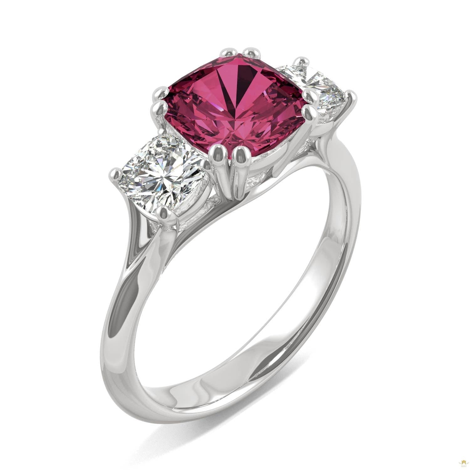 Three gorgeous cushion cut gems illuminate this three-stone ring. A larger ruby set in double prongs at the center, is showcased slightly higher than the petite moissanite gems at the sides. Crafted in 14k gold with a knife edge band. Makes a beautiful engagement ring or right-hand ring.