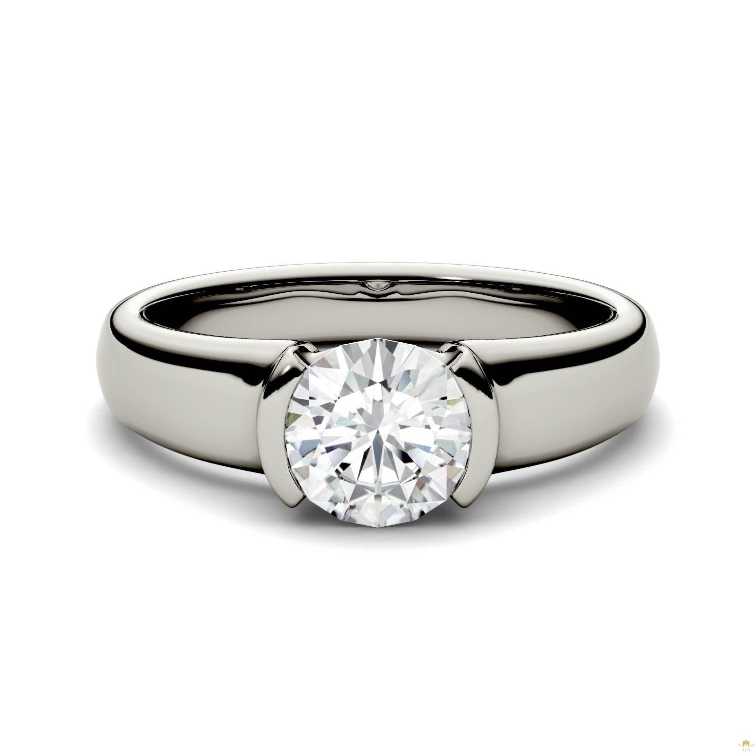 The unique half bezel setting makes for a one of a kind ring that beautifully showcases the round cut center stone. Shine bright and make a statement with this gorgeous piece.