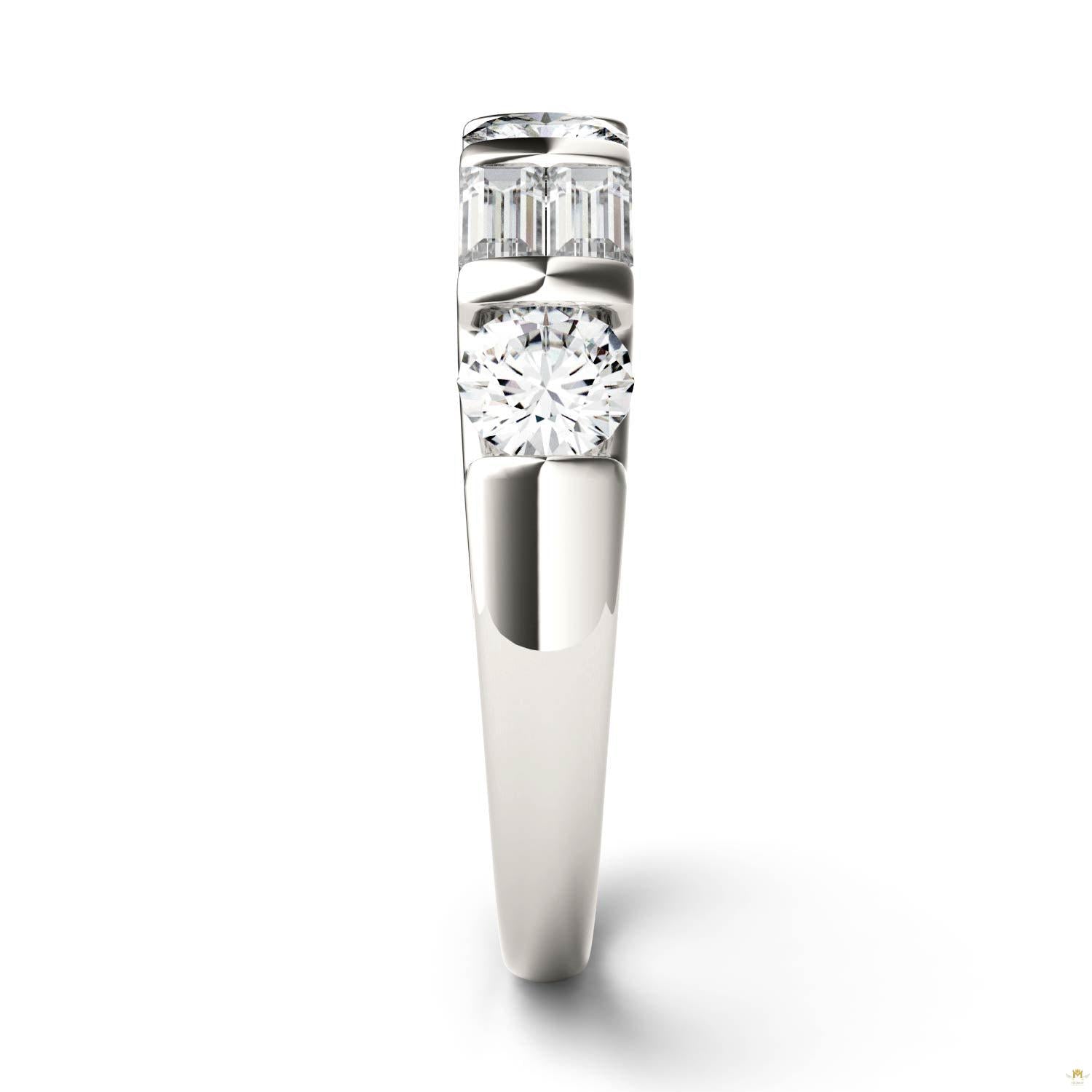 Alternating between round cut and double baguette stones, this ring is the perfect band to pair with any engagement style or be worn alone. The bar setting makes it bold and impossible to miss. It is time to turn heads!