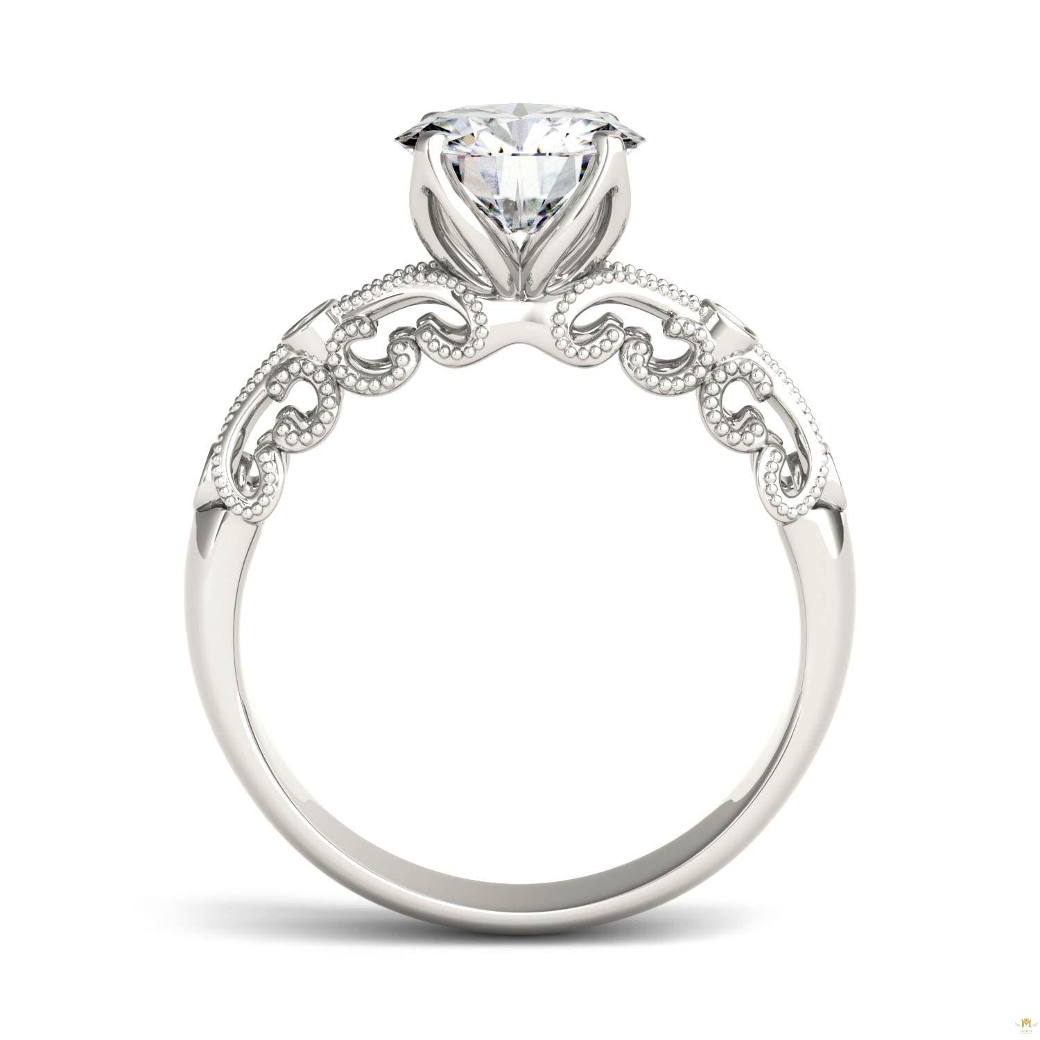 Boasting a vintage aesthetic and chic appeal, this round brilliant moissanite solitaire engagement ring features an intricate milgrain design with petite accent gems dotting the top. Set in 14k white gold, it carries a total diamond equivalent weight of 1.54ct.