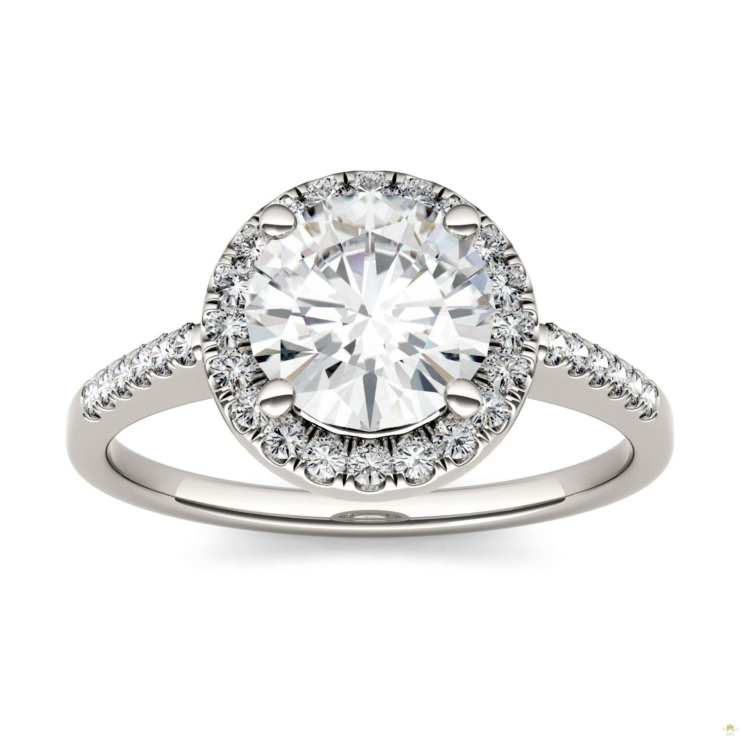 Treat her like an angel with this stunning halo Moissanite by Charles & Colvard® ring. The center stone is a 7.5mm round moissanite surrounded by a halo of 1.3mm moissanites which also accent the shoulders of the band. The band is crafted from 14k white gold with a polished finish. It features 1.82ct total diamond equivalent weight.