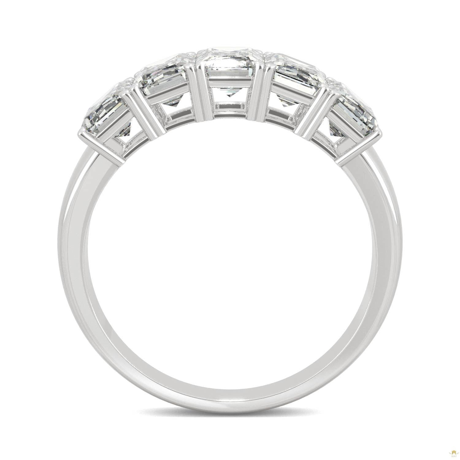 Stunning, unique and so very special. This polished 14k white gold band displays a row of brilliance, fashioned with five emerald cut moissanite gemstones totaling a diamond equivalent weight of 2.90ct. It’s a shine that mirrors her beauty.