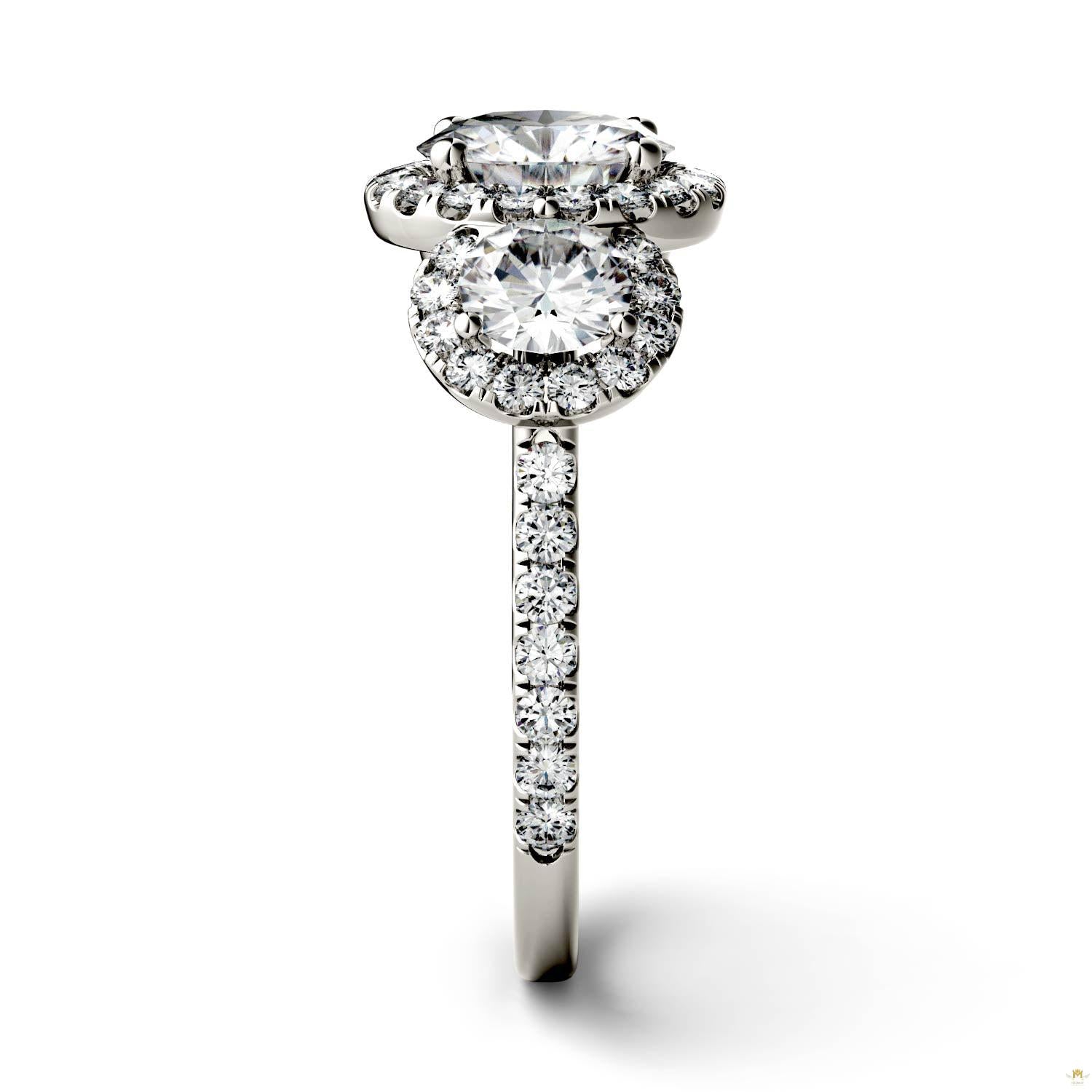A triple halo design makes this engagement ring an elegant cut above your average three stone ring. A large round moissanite stone is prong set and nestled between two smaller stones, with each impeccably enveloped by a halo of shimmery accent gems. Additional accent gems line the shoulders for a glamourous, high-shine finish.