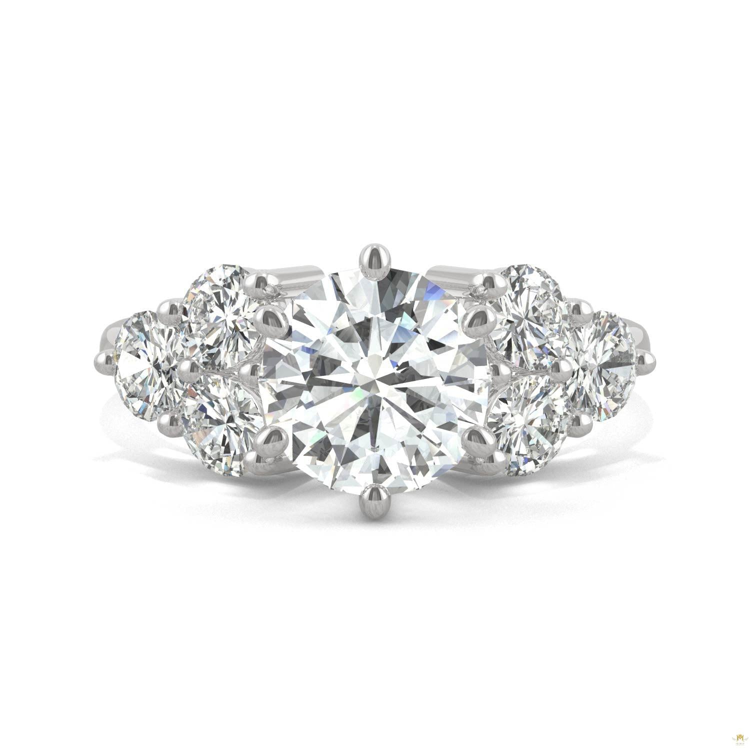 All this brilliance nestled together for maximum sparkle. An 8.0mm round moissanite shines at the center of this engagement ring and is flanked by a trio of accent gems on each side. Set in 14k white gold, it carries a total weight of 3.28ct.