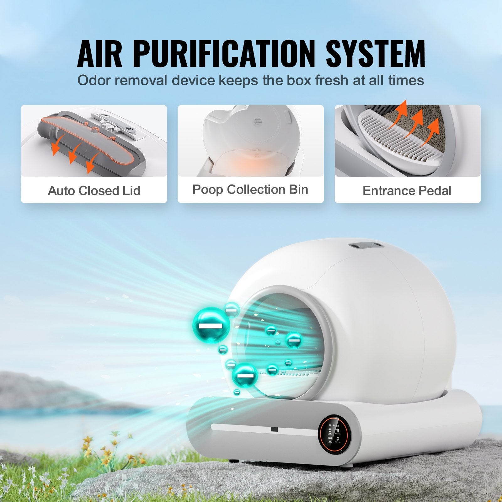 - Odor Control System: Optimized internal design includes a flip-up liner, automatic closure of the waste bin lid, and an integrated drum and bin to minimize gaps and prevent leaks and odors. The air purification system utilizes ion deodorization and Ag+ sterilization technologies. Each cleaning cycle defaults to an odor elimination process, keeping the air fresh and providing a comfortable environment for your cat.