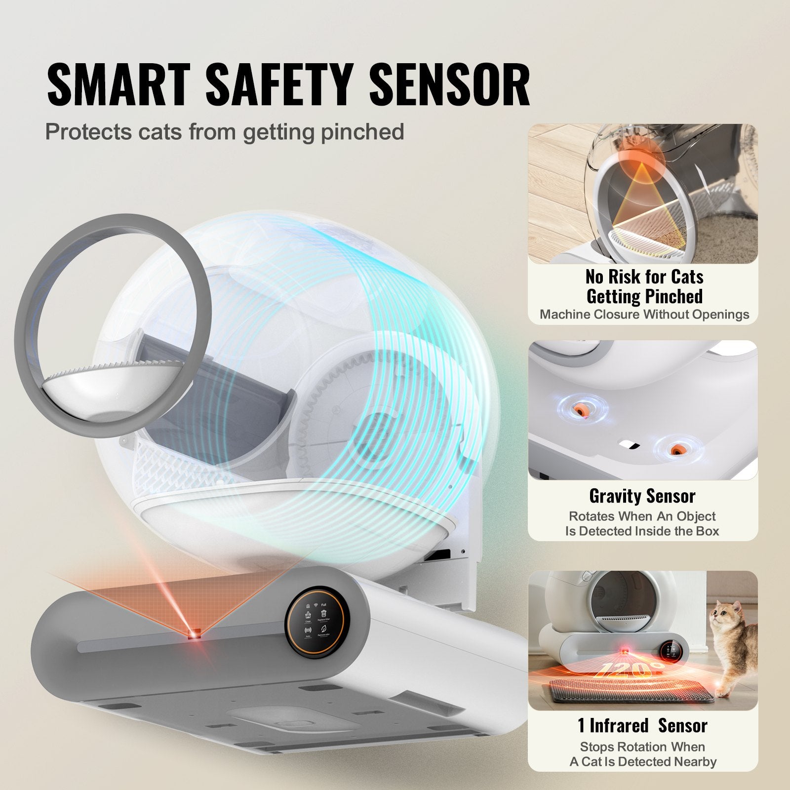 - Safe and Convenient: Four gravity sensors on the bottom and front infrared sensors automatically stop the rotation when a cat approaches, ensuring safety and preventing injury. The smart WiFi and touch panel allow for real-time monitoring and easy operation. The removable filter and liner make cleaning simple, while low noise operation and additional accessories like an entry mat, litter mat, trash bags, and a pet brush enhance the overall experience.